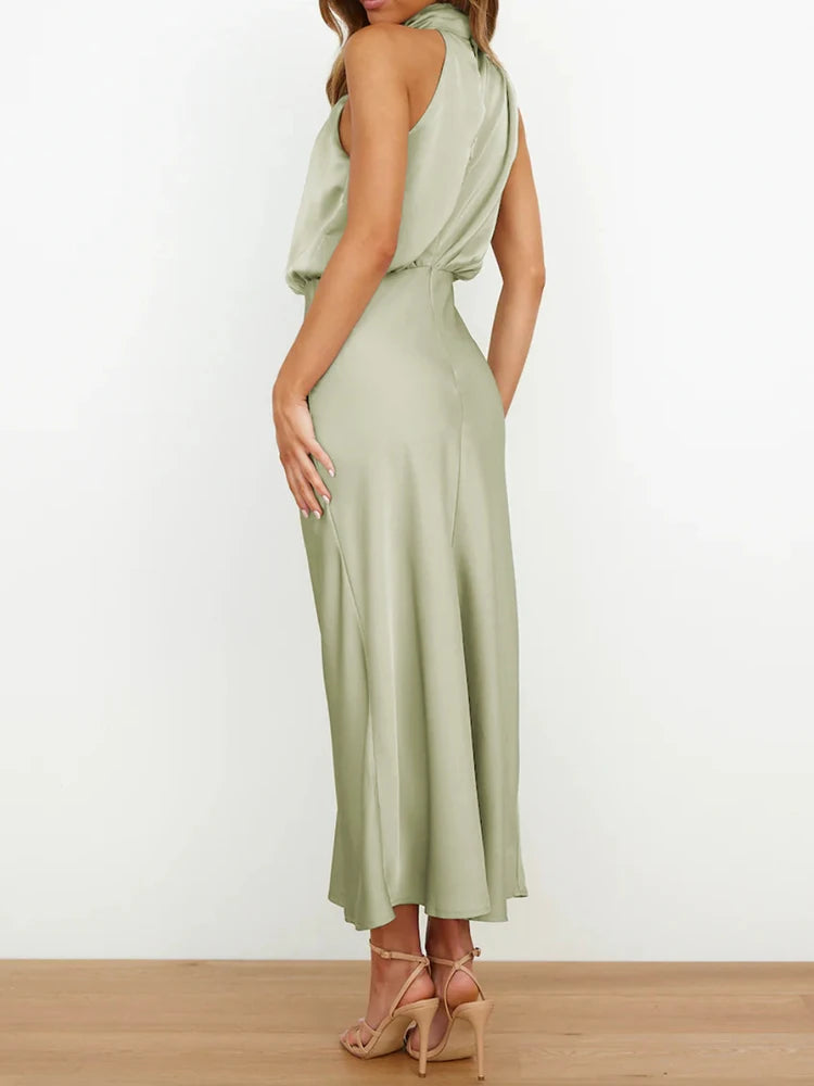 La robe vert en satin à col haut sans manche, la pièce qu’il vous manquait